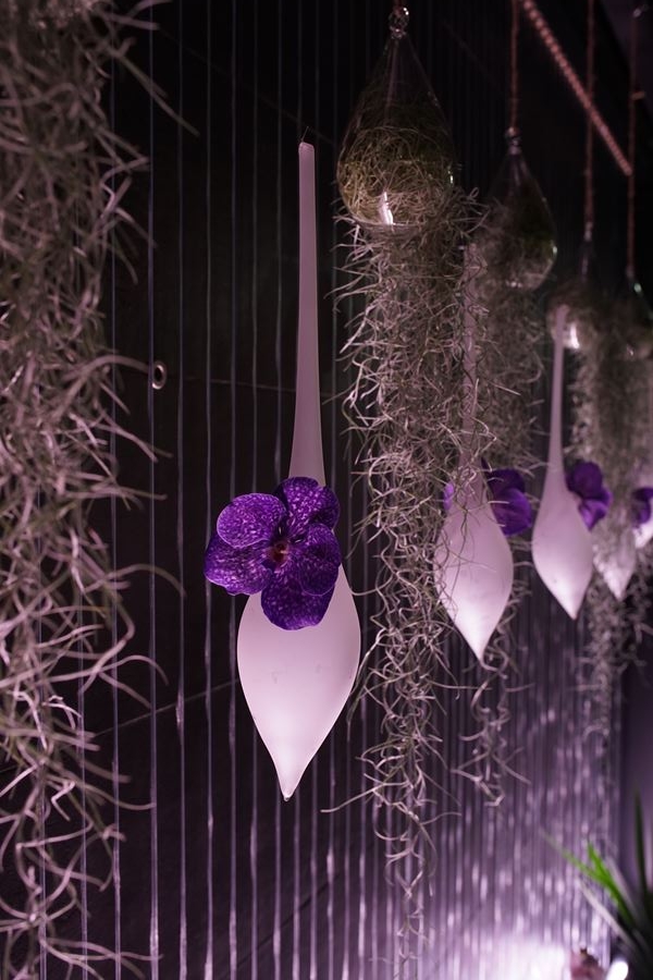 Vous trouverez également derrière le comptoir de jolis vases suspendus accompagnés de tillandsias usneoides qui apportent une jolie touche tropicale à la décoration.